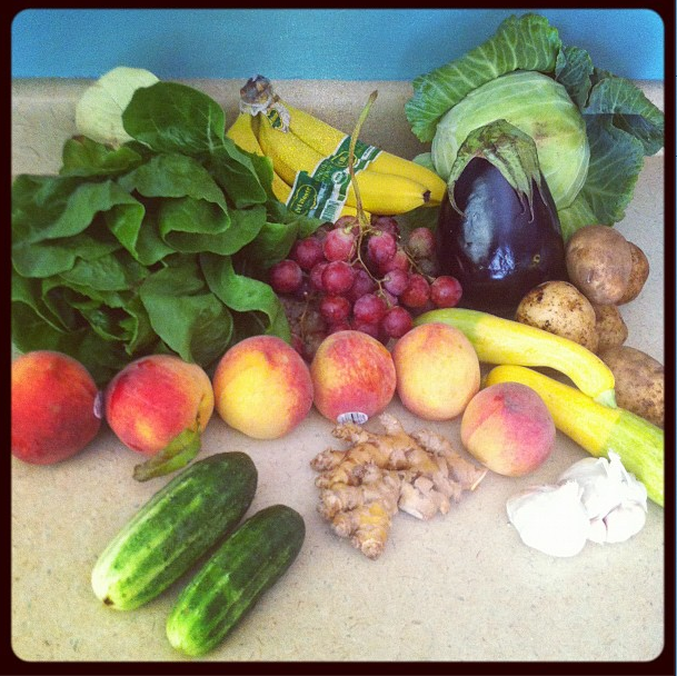 This Week’s Basket Included Bananas, South Carolina Peaches, Red Globe Grapes (caution: watch out for seeds), Tommy Atkins Mangos (not pictured: we got more of something else), Purple Garlic, Ginger, Local Green Cabbage, Hurricane Creek Romaine Lettuce, Globe Eggplant, Russet Potatoes, and Bioway Farms’ Squash and Cucumbers.